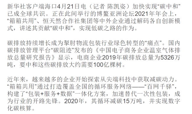来自新华社消息:加快实现“碳中和”已成全球共识。正在此间举行的博鳌亚洲论坛2021年年会上,“箱箱共用”、恒天然合作社集团等中外企业通过解码各自创新模式,讲述其贡献“碳中和”,实现低碳之路的作为。