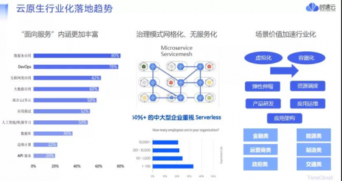 对于传统企业而言,云原生为业务的核心竞争力提供了强有力的底层支撑,使企业能够将更多的人力、精力和成本投入到业务的研发与创新。企业对云原生技术的运用,可以划分为三个阶段,第一个阶段是应用容器化,提升应用部署运维的效率,弹性扩展、跨平台迁移等能力显著增强。第二阶段是服务治理Mesh化,将服务治理能力下沉到基础设施,与应用开发解耦。第三个阶段,是Serverless,目前采用 Serverless的企业主要偏互联网,传统企业用 Serverless 还处在比较初级的阶段。