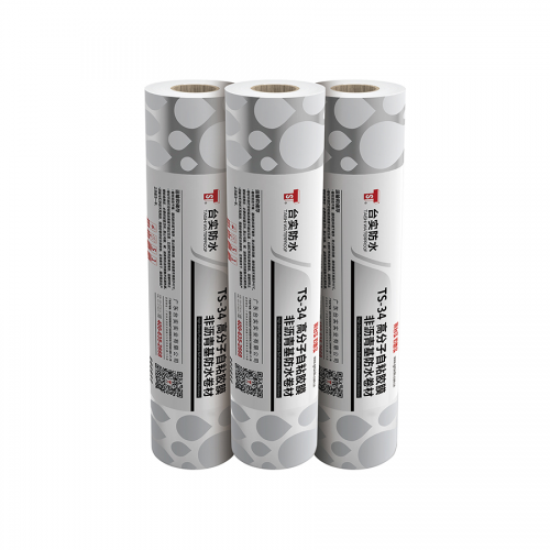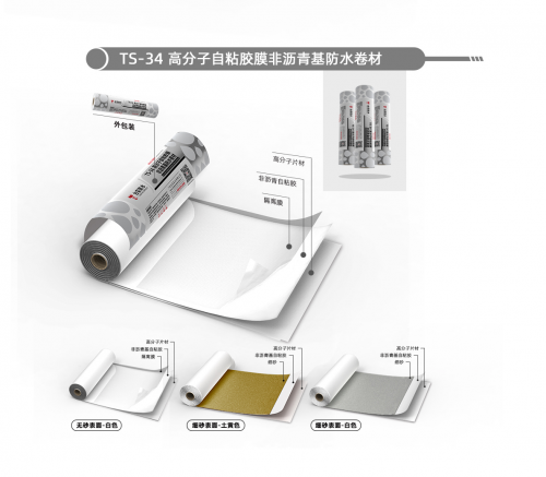 台实TS-34 高分子自粘胶膜非沥青基防水卷材,是以特制的高密度热塑性聚乙烯(HDPE)片材作为防水基材,在HDPE片材的一个面上覆非沥青高分子自粘胶膜作为自粘层,表面覆砂或隔离膜制成的高分子自粘胶膜非沥青基防水卷材。